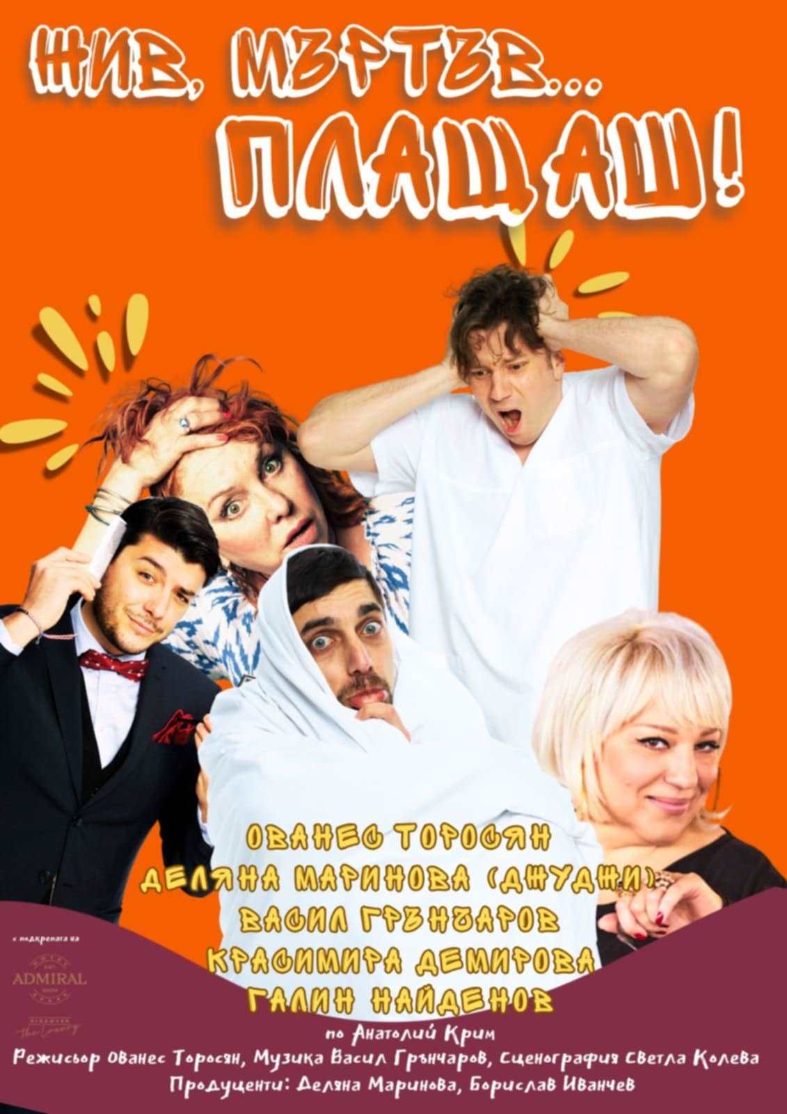 Случвало ли ви се е да се събудите... на собственото си погребение? Точно това се случва с Аркадий. След една тежка нощ той се озовава в моргата на луксозна погребална агенция „Парадайз“, докато съпругата му Лиза вече е поръчала „ол инклузив“ изпращане с оркестър, кетъринг и дори аниматори. Това, което започва като фарс, бързо се превръща в нещо много повече. Фиктивното погребение се оказва катализатор за разпада на един 20-годишен брак. Зад абсурдния хумор се крият разбити мечти, финансово отчаяние и трагичната равносметка за един пропилян живот. Циничният бизнес със смъртта се сблъсква с най-съкровените човешки емоции. Пиесата задава въпросите, от които всички бягаме: Каква е цената на втория шанс? Кога е твърде късно да кажеш „прости ми“ и да започнеш отначало? Може ли всичко в този свят да бъде купено и продадено – дори скръбта? Защо да гледате „Жив, Мъртъв...Плащаш“? Това е пиеса, която ще ви накара да се смеете през сълзи. Тя е вихрена смесица от остър хумор, житейска драма и неочаквани обрати. Ще ви отведе на едно влакче на ужасите от емоции – от абсурдния смях до дълбокото екзистенциално прозрение. Една история за това, че понякога трябва да умреш, за да разбереш как да живееш. АКТЬОРИ: ОВАНЕС ТОРОСЯН КРАСИМИРА ДЕМИРЕВА ВАСИЛ ГРЪНЧАРОВ ГАЛИН НАЙДЕНОВ ДЕЛЯНА МАРИНОВА-ДЖУДЖИ