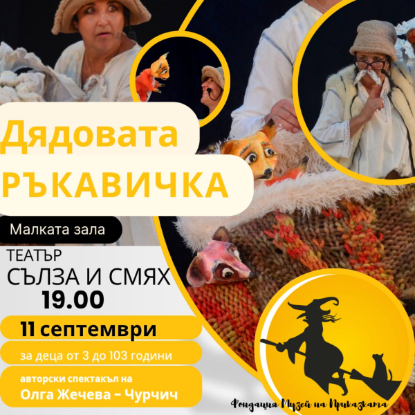 Елате и се посмейте от сърце заедно с героите от "Дядовата Ръкавичка', която се оказва, че не е само българска. До болка позната, но разиграна с много куклено актьорско майсторство и чувство за хумор. Представление за деца от 3 до 103 години. Ама наистина! Които са я гледали в "музея", ще се срещнат с познати герои, но ... по друг начин. Че и на сцена, с осветление и песни изпяти на живо.