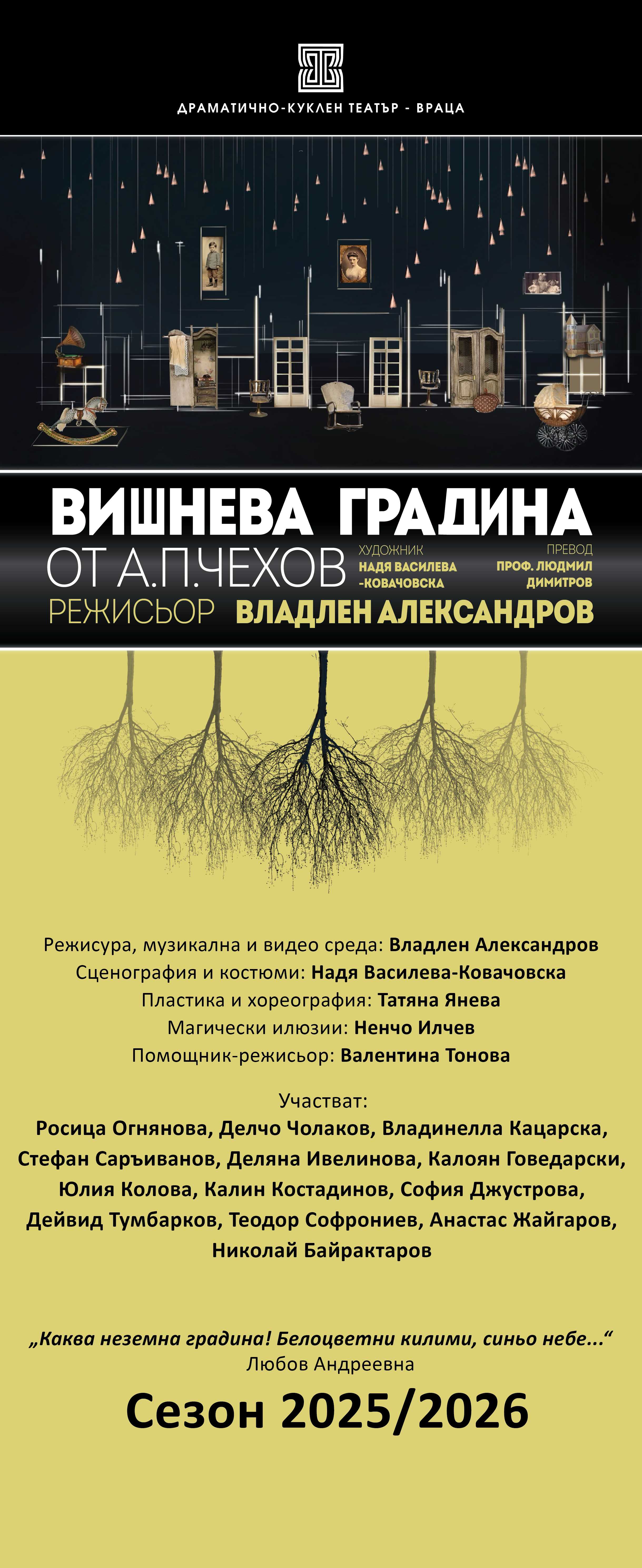 Спектакълът изгражда мост между миналото и настоящето, между класическата драматургия и съвременното мислене. „Вишнева градина“ е покана към зрителя да съпреживее крехкостта на времето и красотата на мига, който никога не се връща.