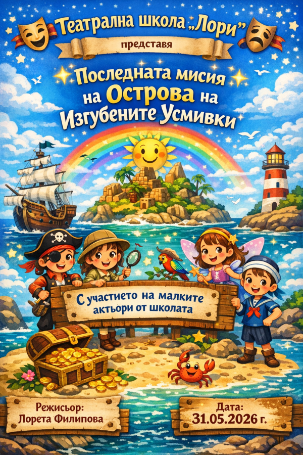 Вълнуващ театрален спектакъл, който отвежда зрителите на мистериозен остров – място, където времето е спряло, а радостта е забравена. Там героите се изправят пред изпитания, които ще проверят тяхната смелост, приятелство и вяра в доброто.